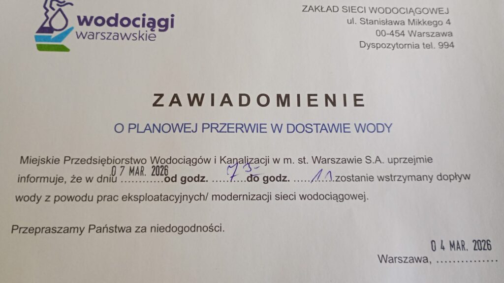 Miejskie Przedsiębiorstwo Wodociągów i Kanalizacji informuje o planowanej przerwie dostawie wody w dn. 21.02.2026 r. (sobota) w godz. 7:00-15:00. MPWiK planuje prace naprawcze sieci wodociągowej.
