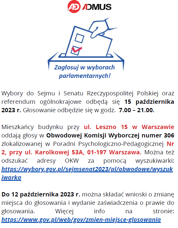 Informujemy, że w czwartek 12.10.2023 r. w kabinach wind będą podłączane kamery . W związku z tym między godz. 8:00 a 16:00 nastąpią 1,5-2,5godzinne przerwy w działaniu dźwigów (każdego z osobna). Prace będą prowadzone po kolei: najpierw klatka 1, potem klatka 2 a na koniec klatka 3. Nie jesteśmy w stanie podać dokładnych godzin, ponieważ nie wiemy czy prace w danej klatce będą prowadzone 1,5h czy może 2,5h. Przepraszamy za utrudnienia.