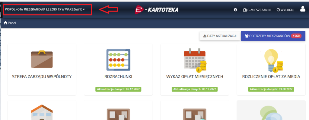 W lewym górnym roku wyświetla się „Wawa Novum”. Należy w to kliknąć i rozwinie się lista z której należy wybrać Wspólnotę Mieszkaniową Leszno 15. Zaznaczyłam to miejsce czerwoną strzałką na załączonym powyżej zdjęciu.
