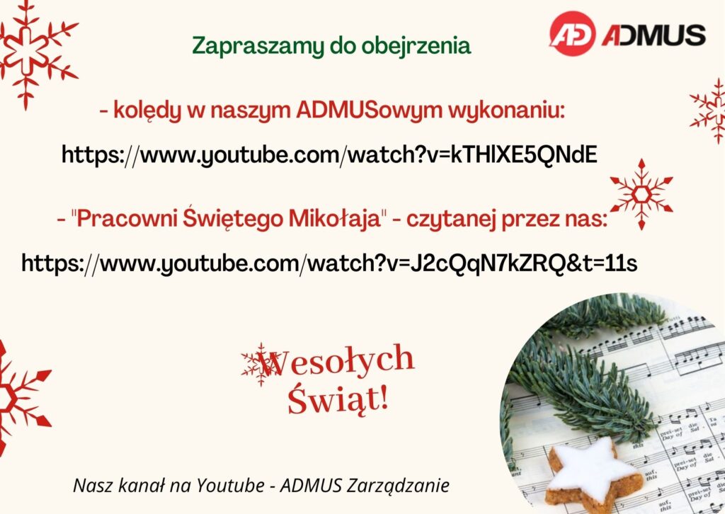 Przy tej okazji Zespół ADMUS życzy Państwu przede wszystkim zdrowia, radości i wspaniałej atmosfery wśród zapachu choinki i świątecznych smakowitości. A w Nowym Roku wszelkiej pomyślności!