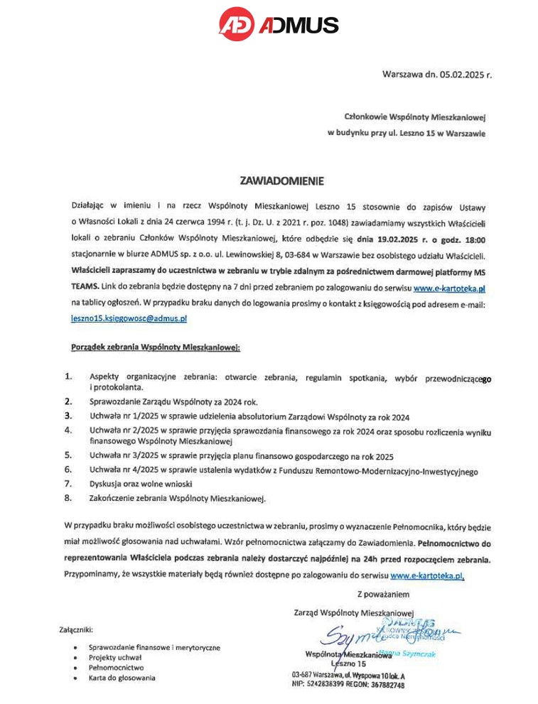Zgodnie z ustawą o własności lokali, w I kwartale roku 2025 zostanie przeprowadzone sprawozdawcze zebranie Wspólnoty podsumowujące działalność Zarządu i administracji za rok 2024. O dokładnym terminie zostaną Państwo poinformowani z wyprzedzeniem wynikającym z zapisów ustawy o własności lokali. Wraz z terminem zebrania otrzymają Państwo również szczegółowy opis działań oraz sprawozdanie finansowe za mijający rok. W materiałach, jak co roku znajdą się też propozycje kolejnych uchwał i planów Wspólnoty na kolejny rok. Już dziś zapraszamy do wzięcia udziału w zebraniu. Dodatkowo po wcześniejszym umówieniu terminu, jednak nie wcześniej niż w lutym 2025 będzie możliwość, na indywidualny wniosek Właściciela złożony do administracji osiedla, okazania wszelkich dokumentów Wspólnoty, w tym również księgowych.